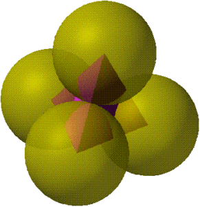 Každý atom křemíku je ve středu čtyřstěnu s atomy kyslíku v jeho čtyřech rozích.