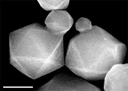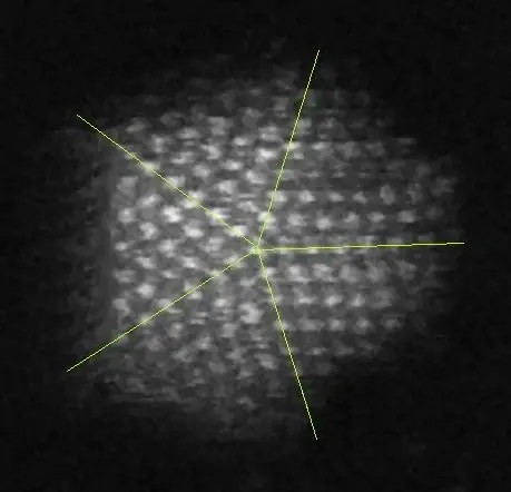 Snímek z transmisní elektronové mikroskopie 5-ti zdvojených ikosaedrických zlatých (Au) nanočástic.