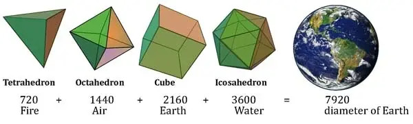 Čtyřstěn (oheň) 720 + osmistěn (vzduch) 1440 + krychle (země) 2160 + dvacetistěn (voda) 3600 = 7920 = průměr Země v mílích (přesnost 99,97 %).