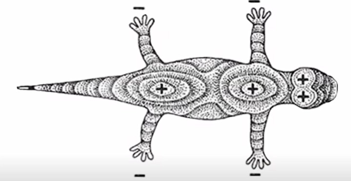 Vektor intenzity těchto polí prochází mozkem a míchou a tvoří zvláštní osu podél nervového systému.
