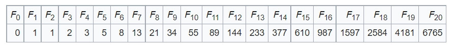Prvních 21 Fibonacciho čísel Fn pro n = 0, 1, 2, ..., 20: