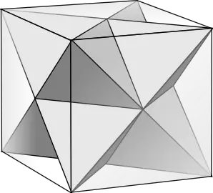 Zde jsou dva do sebe zapadající čtyřstěny (hvězdný čtyřstěn nebo hvězdicový osmistěn) v krychli: