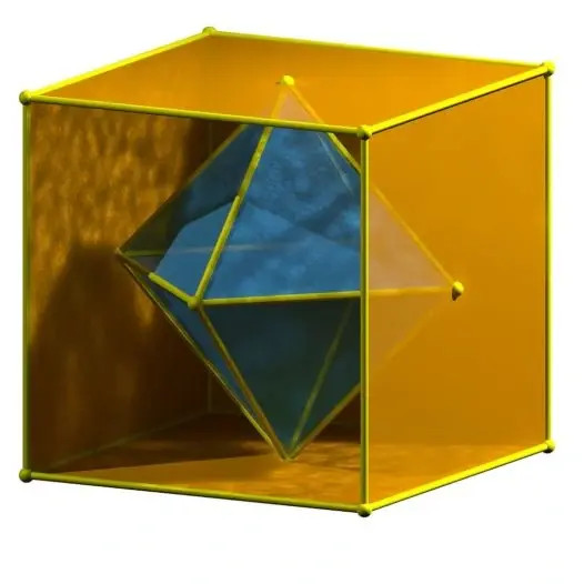 Oktaedr vzniká průsečíkem dvou čtyřstěnů nebo jako dualita krychle, což demonstruje princip symetrie a vnitřního propojení.