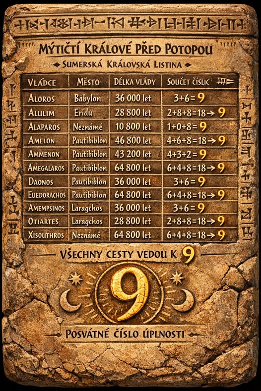 V této soustavě měla čísla nejen matematický, ale i symbolický význam. A právě tady se objevuje nápadná souvislost s číslem 9.Když se podíváme na délky vlády mýtických králů, například 36 000, 28 800 nebo 64 800 let, zjistíme zajímavou věc. Součet číslic těchto čísel dává vždy 9. Například 3+6 = 9, 2+8+8 = 18 → 1+8 = 9, 6+4+8 = 18 → 9. To se opakuje znovu a znovu.