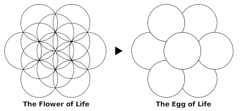 - Vybráním 13 středových kruhů Květu života lze získat základ pro 7 (8 holografických) kružnic Vejce života, které připomíná embryo ve fázi rozdělení do 8 buněk.